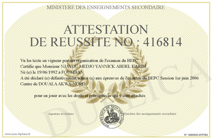 Envoyez par email votre ATTESTATION DE REUSSITE No : 416814 personalisé