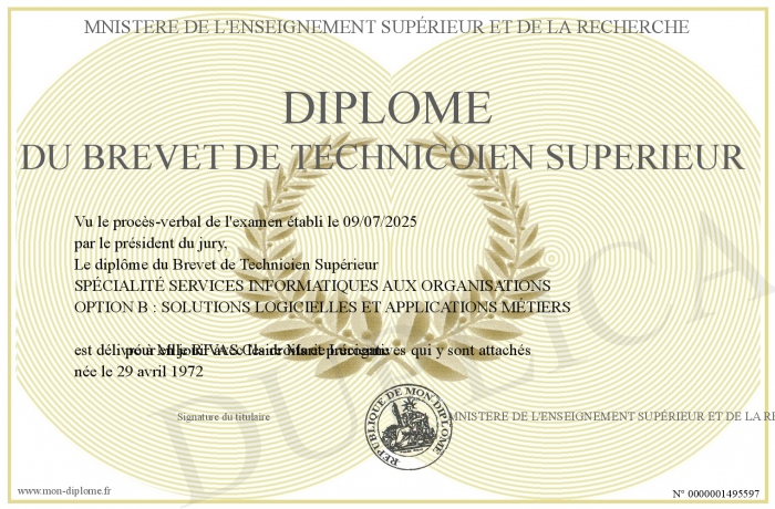Envoyez par email votre Diplôme du brevet de Technicoien Supérieur personalisé