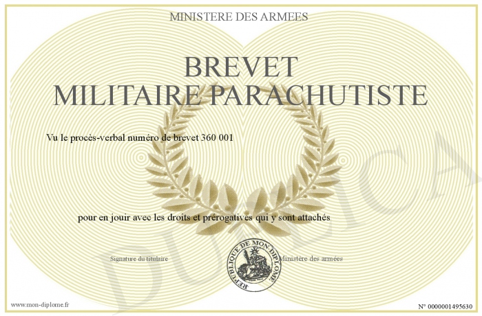 Envoyez par email votre BREVET MILITAIRE PARACHUTISTE personalisé