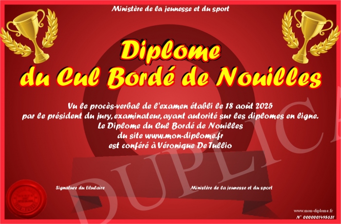 Envoyez par email votre Diplôme du Cul Bordé de Nouilles personalisé