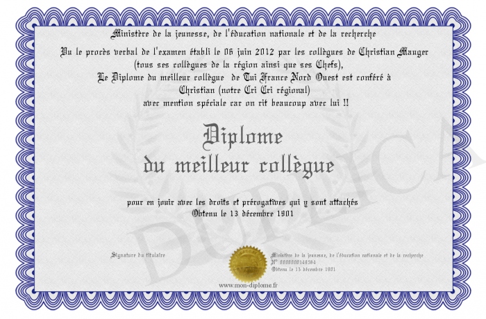 Envoyez par email votre Diplôme du meilleur collègue personalisé