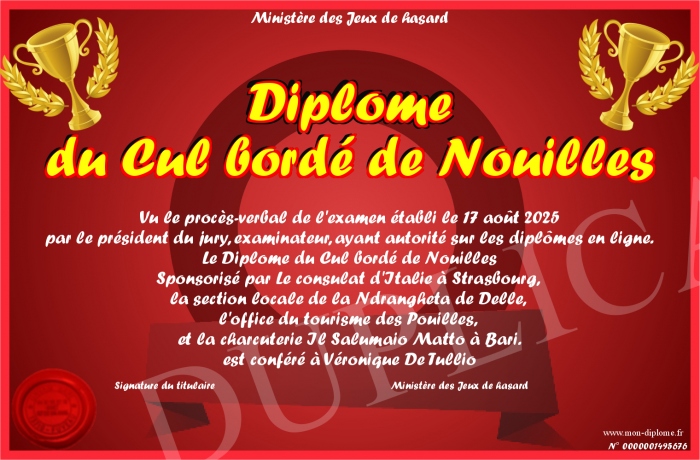 Envoyez par email votre Diplôme du Cul bordé de Nouilles personalisé