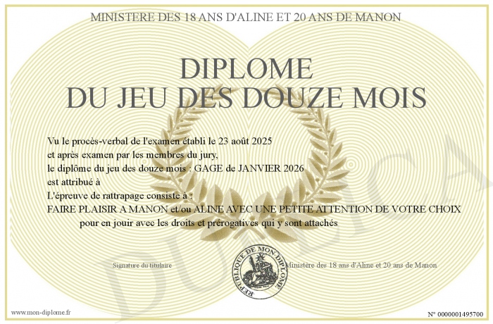 Envoyez par email votre Diplôme du jeu des douze mois personalisé