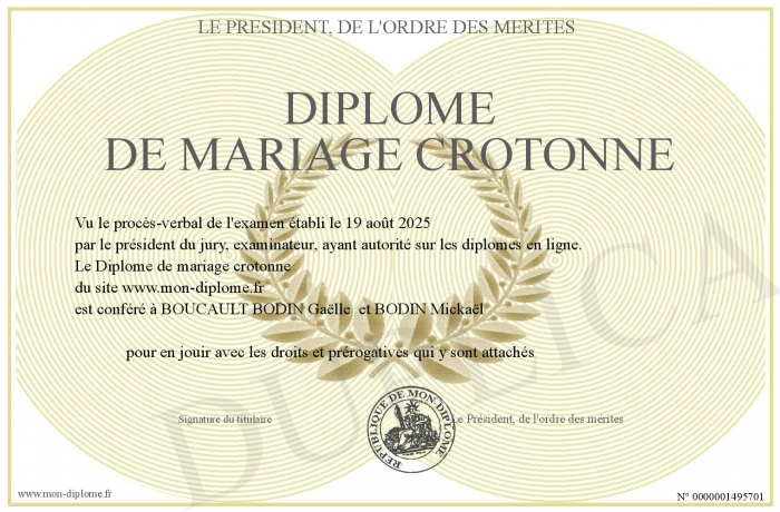 Envoyez par email votre Diplôme de mariage crotonne personalisé