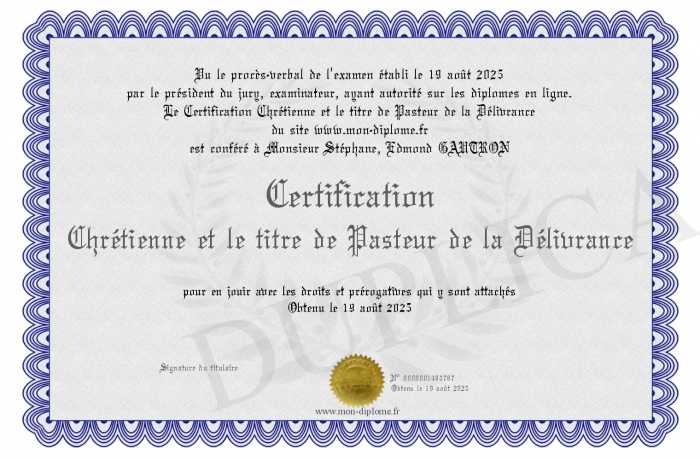 Envoyez par email votre Certification Chrétienne et le titre de Pasteur de la Délivrance personalisé