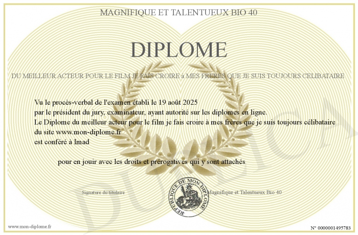 Envoyez par email votre Diplôme du meilleur acteur pour le film je fais croire à mes frères que je suis toujours célibataire personalisé