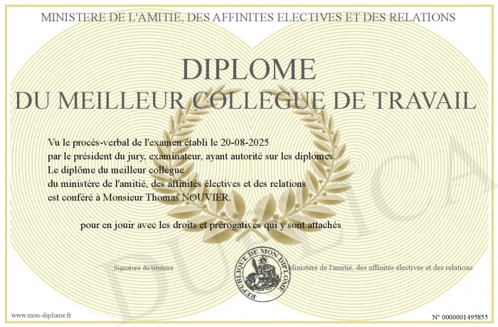 Envoyez par email votre Diplôme du meilleur collègue de travail personalisé