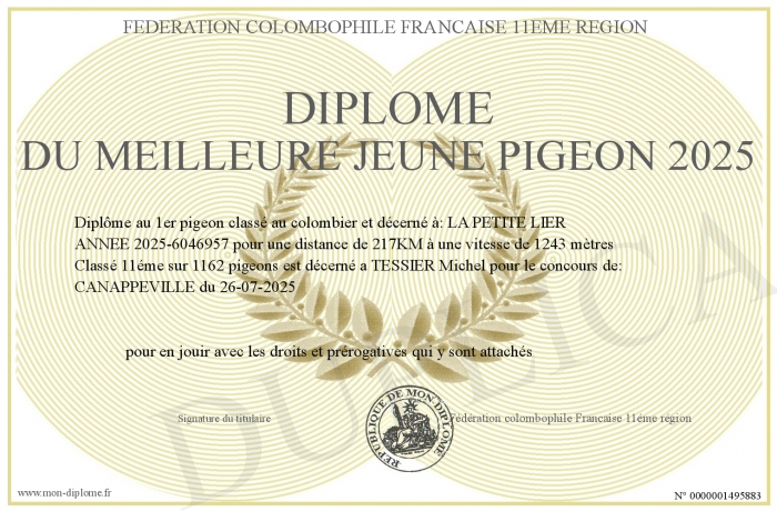 Envoyez par email votre Diplôme du meilleure Jeune pigeon 2025 personalisé