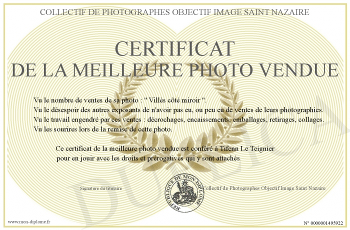 Envoyez par email votre Certificat de la meilleure photo vendue personalisé