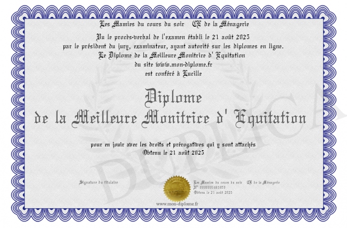 Envoyez par email votre Diplôme de la Meilleure Monitrice d' Equitation personalisé