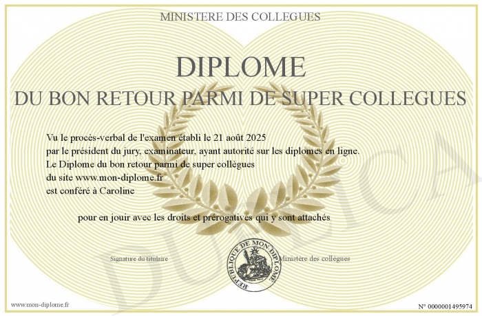 Envoyez par email votre Diplôme du bon retour parmi de super collègues personalisé