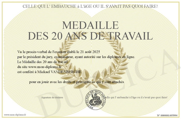 Envoyez par email votre Médaille des 20 ans de travail personalisé