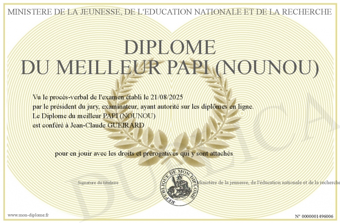Envoyez par email votre Diplôme du meilleur PAPI (NOUNOU) personalisé