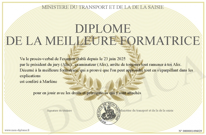 Envoyez par email votre Diplôme de la meilleure formatrice personalisé
