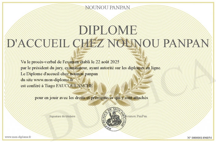 Envoyez par email votre Diplôme d'accueil chez nounou panpan personalisé
