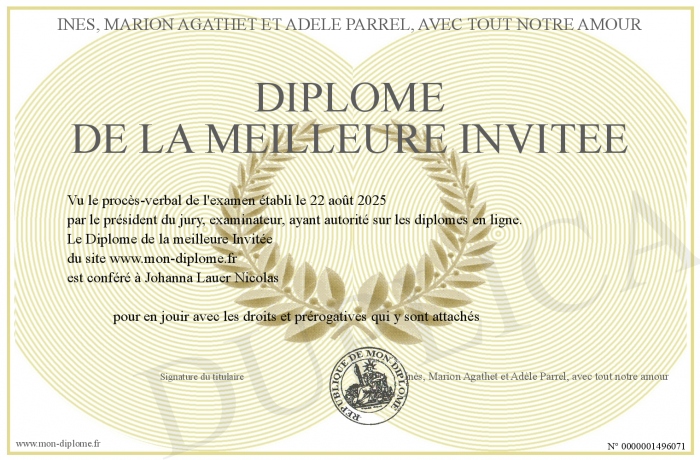 Envoyez par email votre Diplôme de la meilleure Invitée personalisé