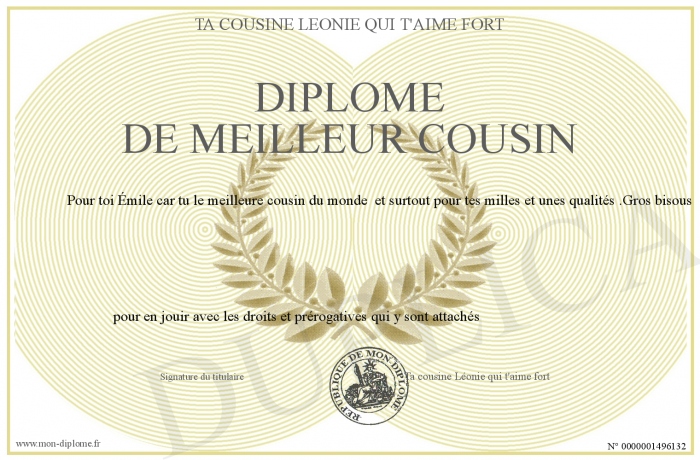 Envoyez par email votre Diplôme de meilleur cousin personalisé