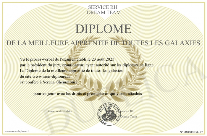 Envoyez par email votre Diplôme de la meilleure apprentie de toutes les galaxies personalisé