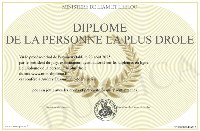 Envoyez par email votre Diplôme de la personne la plus drôle personalisé