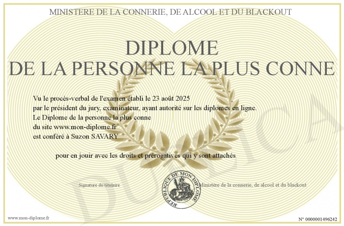 Envoyez par email votre Diplôme de la personne la plus conne personalisé