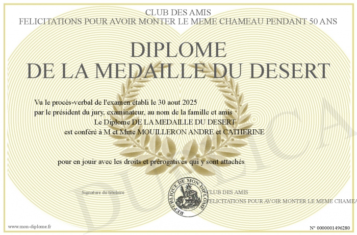 Envoyez par email votre Diplôme DE LA MEDAILLE DU DESERT personalisé