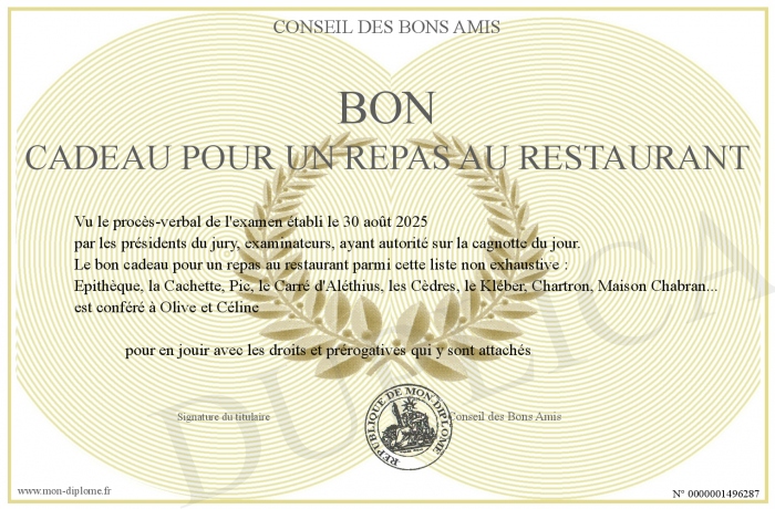 Envoyez par email votre BON CADEAU POUR UN REPAS AU RESTAURANT personalisé