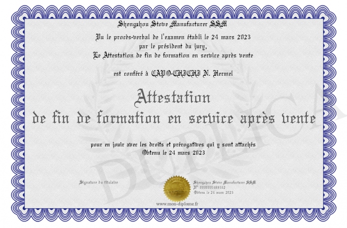 Envoyez par email votre Attestation de fin de formation en service après vente personalisé