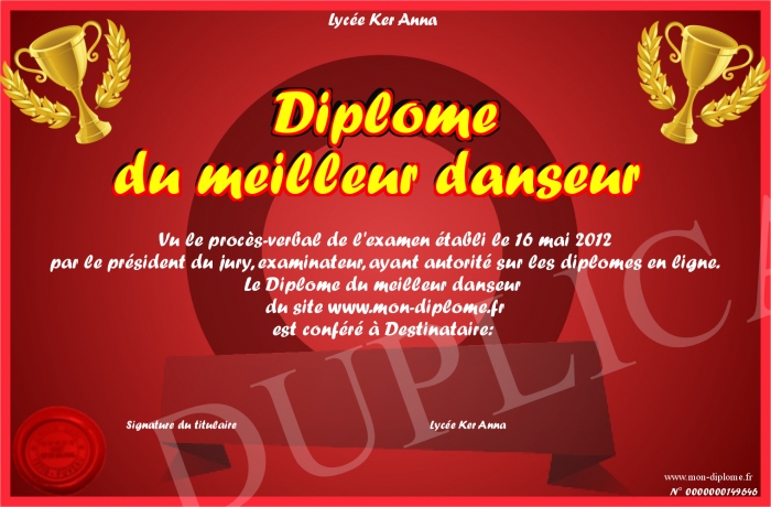 Envoyez par email votre Diplome du meilleur danseur personalisé
