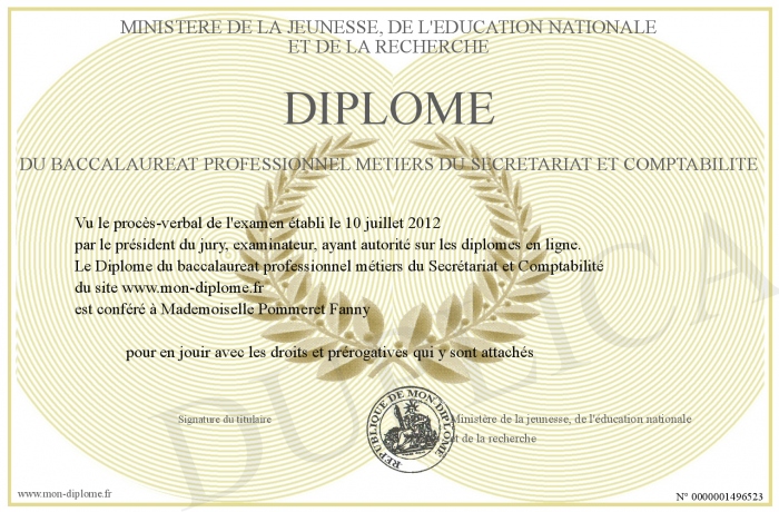 Envoyez par email votre Diplôme du baccalaureat professionnel métiers du Secrétariat et Comptabilité personalisé