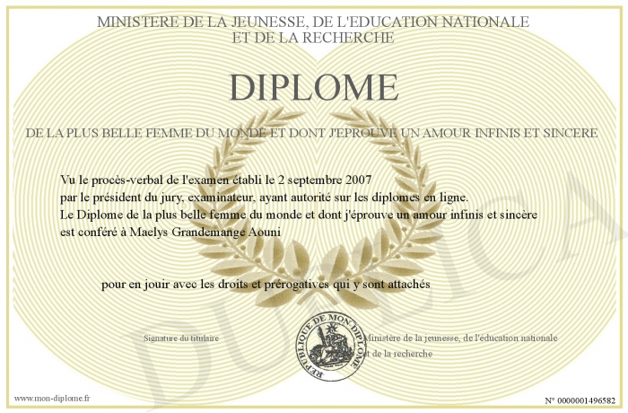 Envoyez par email votre Diplôme de la plus belle femme du monde et dont j'éprouve un amour infinis et sincère personalisé