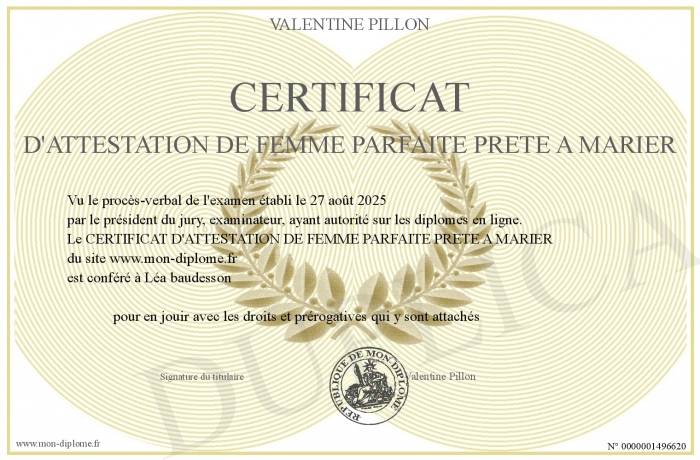 Envoyez par email votre CERTIFICAT D'ATTESTATION DE FEMME PARFAITE PRETE A MARIER personalisé