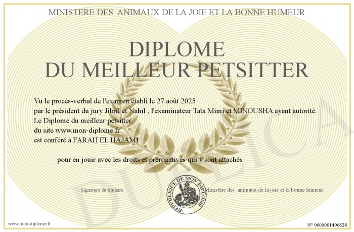 Envoyez par email votre Diplôme du meilleur petsitter personalisé