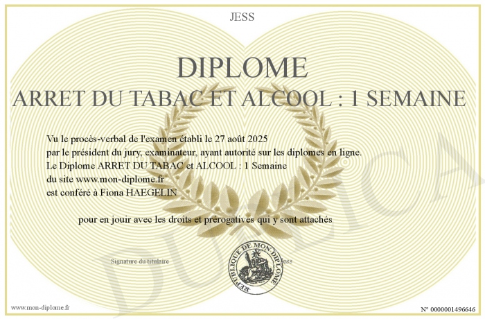 Envoyez par email votre Diplôme ARRET DU TABAC et ALCOOL : 1 Semaine personalisé