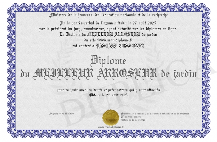 Envoyez par email votre Diplôme du MEILLEUR ARROSEUR de jardin personalisé