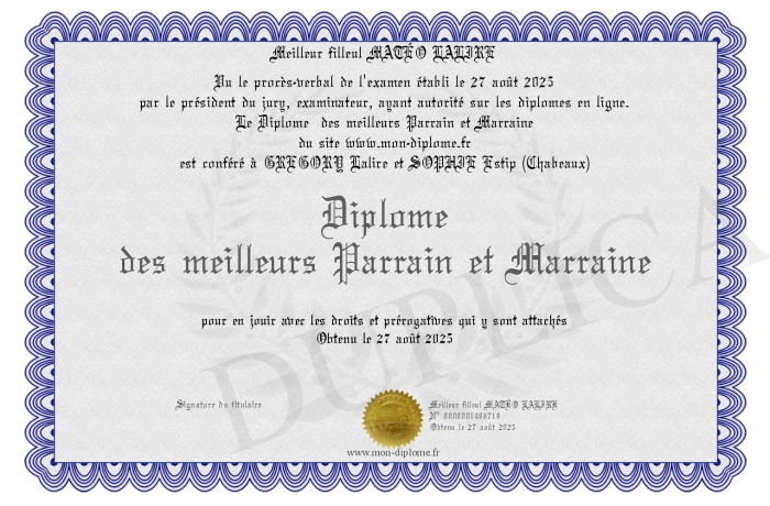 Envoyez par email votre Diplôme des meilleurs Parrain et Marraine personalisé