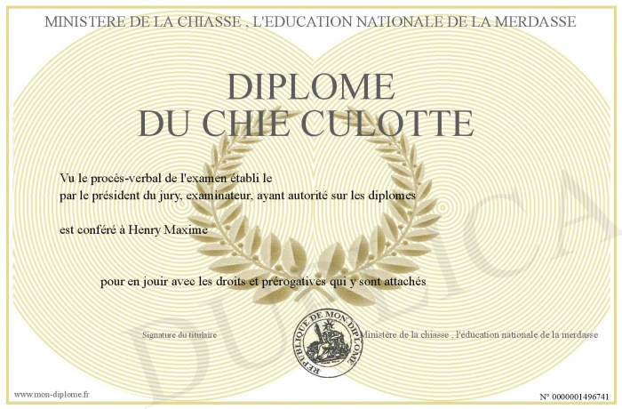 Envoyez par email votre Diplôme du Chie Culotte personalisé