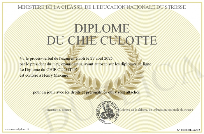 Envoyez par email votre Diplôme du CHIE CULOTTE personalisé