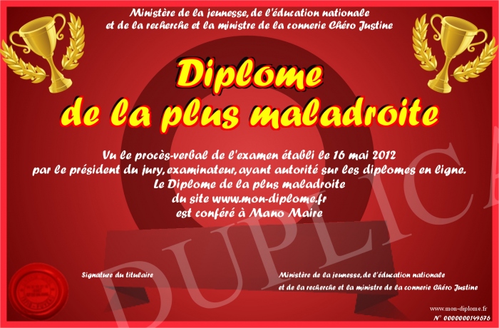 Envoyez par email votre Diplôme de la plus maladroite personalisé