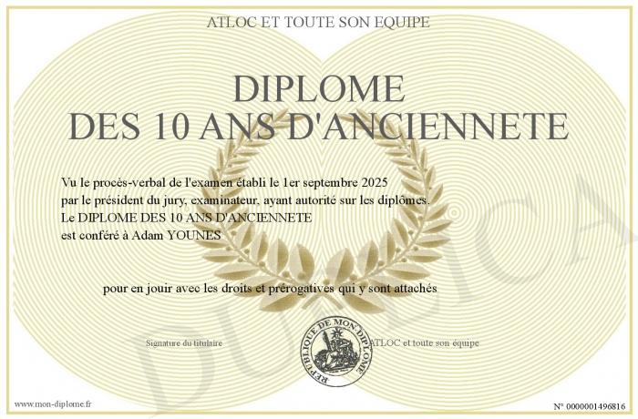 Envoyez par email votre DIPLOME DES 10 ANS D'ANCIENNETE personalisé