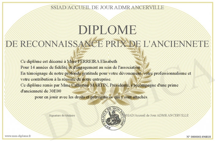 Envoyez par email votre Diplôme de reconnaissance Prix de l'ancienneté personalisé