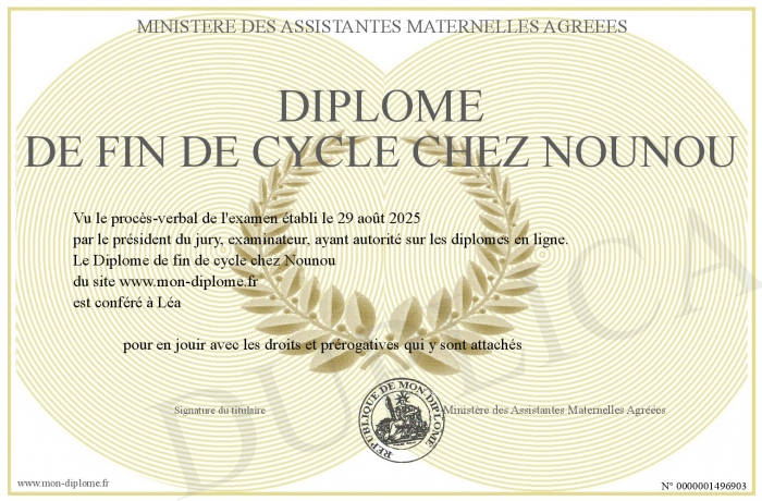 Envoyez par email votre Diplôme de fin de cycle chez Nounou personalisé