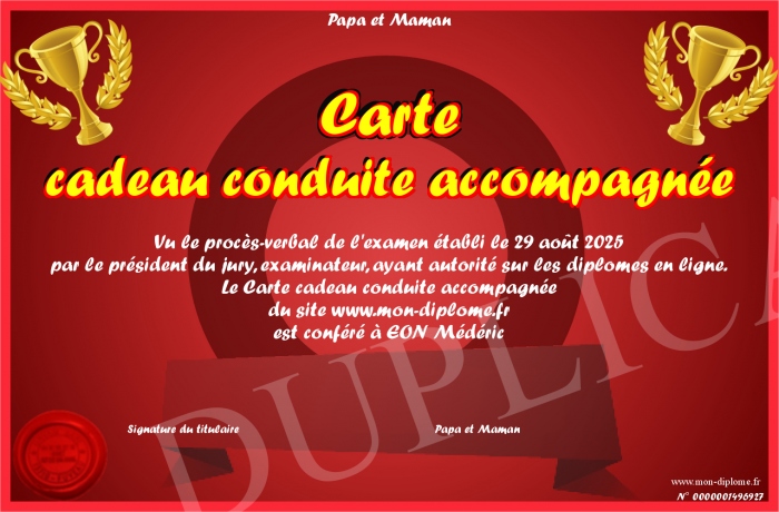 Envoyez par email votre Carte cadeau conduite accompagnée personalisé