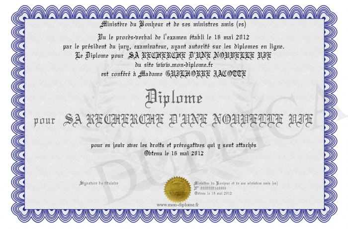 Envoyez par email votre Diplôme pour SA RECHERCHE D'UNE NOUVELLE VIE personalisé