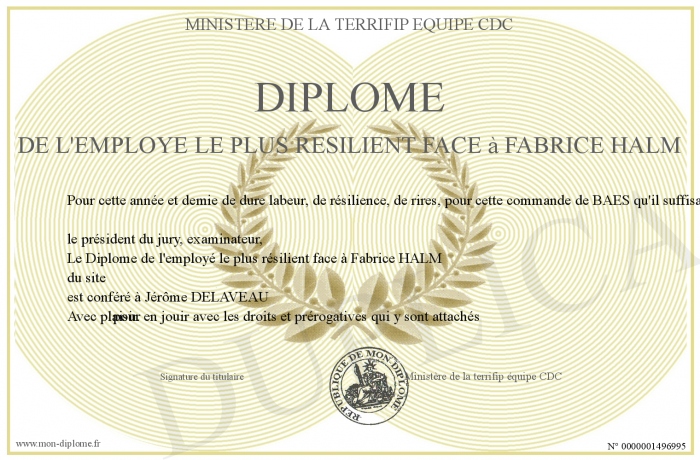 Envoyez par email votre Diplôme de l'employé le plus résilient face à Fabrice HALM personalisé
