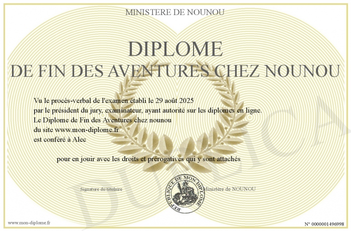 Envoyez par email votre Diplôme de Fin des Aventures chez nounou personalisé