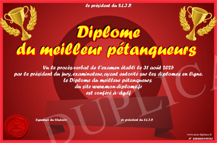 Envoyez par email votre Diplôme du meilleur pétanqueurs personalisé