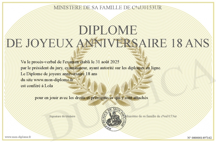 Envoyez par email votre Diplôme de joyeux anniversaire 18 ans personalisé