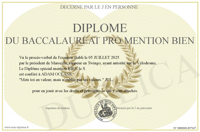 Envoyez par email votre Diplôme du baccalauréat pro Mention BIEN personalisé