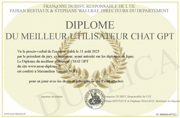Envoyez par email votre Diplôme du meilleur utilisateur CHAT GPT personalisé