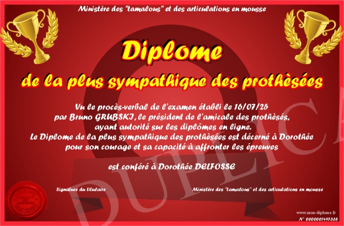 Envoyez par email votre Diplôme de la plus sympathique des prothèsées personalisé